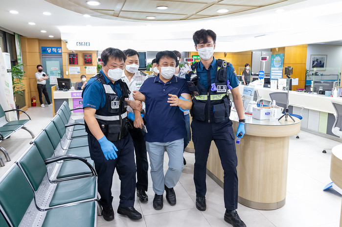 서울 강서구는 20일 본관 1층 민원실에서 '특이민원 대비 모의훈련'을 실시했다. 이날 훈련은 비상상황에 대비하기 위한 것으로 민원인이 담당 공무원에게 폭언·폭행을 하는 상황을 가정해 진행됐다. 사진은 모의훈련에서 강서구청 비상대응반과 경찰이 직원에게 폭언·폭행을 한 민원인을 제압하고 있는 모습. (사진제공=강서구청)