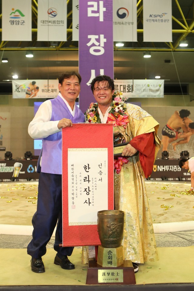 경기 광주시청 씨름팀 소속 박정진 선수가 ‘2019 추석 장사씨름대회’에서 한라장사에 등극했다. 지난 10~15일 전남 영암군에서 개최된 ‘2019 추석 장사씨름대회’에서 박 선수는 한라급 장사결정전(5전3승제)에서 김민우 선수(창원시청)에게 첫판을 내주고도 내리 세 판을 따내며 3대1로 역전승을 거뒀다. 사진은 박 선수(오른쪽)가 한라장사 인증서를 들고 기념촬영을 하는 모습. (사진제공=광주시청)