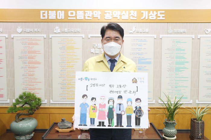 박준희 서울 관악구청장이 24일 코로나19 상황에서 감염의 위험을 무릅쓰고 대면업무를 수행하고 있는 보건·의료 등 필수노동자에게 고마움과 격려의 마음을 전하는 ‘고맙습니다. 필수노동자’ 캠페인에 동참했다. 사진은 박 구청장이 캠페인에 참여하고 있는 모습. (사진제공=관악구청)