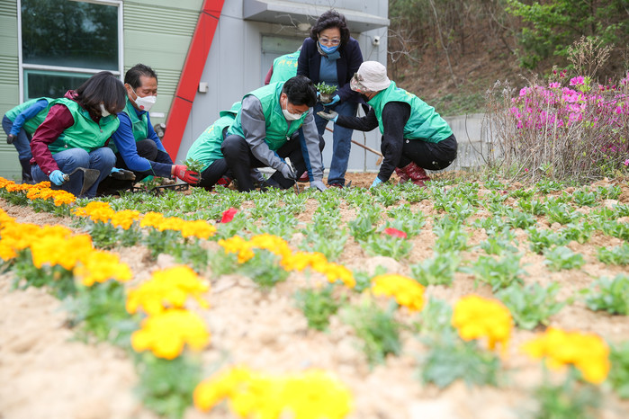 경기 이천시 신둔면 새마을협의회에서는 봄을 맞아 최근 도로변 꽃길식재 작업을 실시해 수광리 넋고개 주변 및 신둔 실내체육관 앞은 메리골드 등 꽃을 식재하고, 신둔도예촌역에서 인근엔 꽃잔디를 식재했다. 사진은 이날 엄태준 시장(가운데)이 새마을협의회 회원들과 함께 꽃을 심고 있는 모습. (사진제공=이천시청)