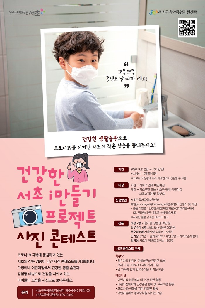 코로나19 극복을 위해 재밌고 톡톡튀는 생활 습관으로 건강을 지키고 있는 아이들의 사진 또는 영상을 오는 18일까지 서초구육아종합지원센터 로 접수하면 된다.