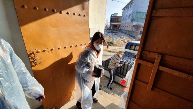 경기 여주시 금사면은 지난 12일 연말을 맞아 전직원이 모여 금사면 이포리에 위치한 취약계층 2가구에 이포고등학교에 재직 중인 박정순씨와 금사1리 주민 정안심씨가 기부한 연탄 500장씩을 전달하는 ‘사랑의 연탄나눔’ 봉사활동을 실시했다. 사진은 이날 봉사자들이 연탄을 배달하고 있는 모습. (사진제공=여주시청)