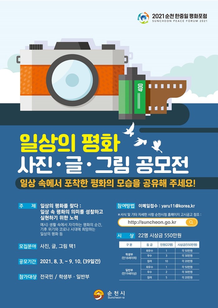 [순천=김민재 기자] 전남 순천시가 오는 10월 개최하는 '2021 순천 한중일 평화포럼'을 기념해 전국민을 대상으로 '일상의 평화'를 주제로 공모전을 개최한다.