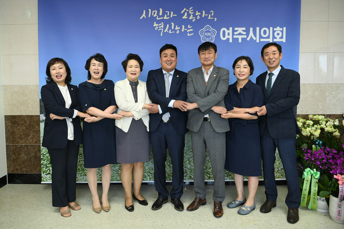 경기 여주시의회가 ‘제3대 여주시의회 후반기 출범식’을 개최하고 앞으로 2년여간 소통과 협치를 통해 후반기 여주시의회를 이끌어나겠다는 새로운 출발을 다짐했다. 사진은 출범식 후 손을 맞잡고 기념촬영을 하고 있는 여주시의원들의 모습. (사진제공=여주시의회)