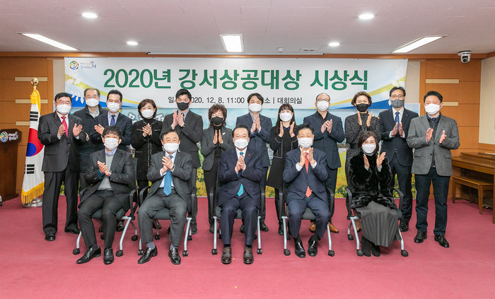 서울 강서구는 지난 8일 ‘2020년 강서상공대상 시상식’을 열고 지역경제 발전을 위해 헌신한 유공자에게 표창장을 수여했다. 올해 수상자는 ▲강서상공대상 ▲사회봉사 ▲공공 부문 등 총 3개 부문 6명과 구청장 표창 3명이다. 사진은 시상식에서 노현송 구청장(앞줄 왼쪽에서 세 번째)과 수상자들이 기념사진을 촬영하고 있는 모습. (사진제공=강서구청)