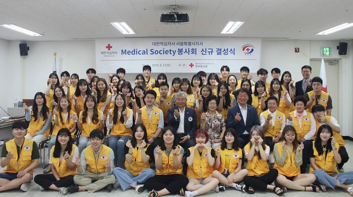 대한적십자사 서울시지사가 지난 17일 북부봉사관에서 '대한적십자사 서울시지사 Medical Society 봉사회'를 결성했다. 이번에 결성되는 봉사회는 의과대학·치과대학 본과 학생 48명이 참여하는 의료전문봉사회다. 사진은 참여자들이 기념촬영을 하는 모습. (사진제공=대한적십자사 서울시지사)