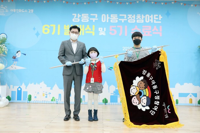 제6기 강동구 아동구정참여단이 최근 발대식을 열고 아동의 권익증진과 정책 모니터링 참여 등 1년간의 임기를 시작했다. 단원들은 공개모집과 기관추천을 통해 선발된 34명의 아동·청소년으로 구성됐다. 사진은 발대식에서 이정훈 구청장(왼쪽)이 단기전달식에 참여한 모습. (사진제공=강동구청)
