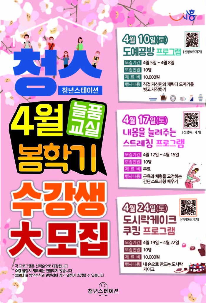 시흥시 4월 주말 프로그램은 도예체험의 기초부터 창업 준비까지 배워볼 수 있는 도예공방 프로그램, 폼롤러를 이용한 스트레칭을 통해 체형을 교정하는 스트레칭 프로그램, 청년스테이션 내 베이킹 도구를 활용하여 도시락케이크를 만들어보는 쿠킹 프로그램으로 구성되어 있다.