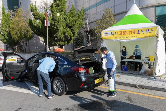 전남 순천시는 대중교통이 코로나19 확산의 매개체가 될 수 있다는 우려에 따라 매일 오전 8시~오후 6시 연향동 조은프라자 앞에 택시 내부를 수시로 소독할 수 있는 소독부스를 운영하고 있다. 사진은 택시운전사가 택시를 소독하고 있는 모습. (사진제공=순천시청)