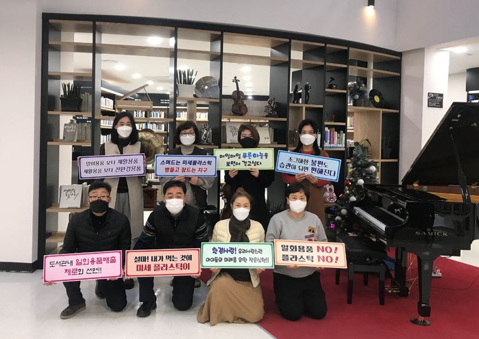 경기 오산시 중앙도서관은 올해부터 모든 도서관내에서는 일회용컵을 배출하지 않기로 하고 지난 4일 시무식을 대신해 도서관별로 직원과 시민의 동참 및 실천을 다짐하는 결의대회를 열었다. 사진은 소리울도서관 직원들이 일회용컵 배출제로화 퍼포먼스를 선보이는 모습. (사진제공=오산시청)