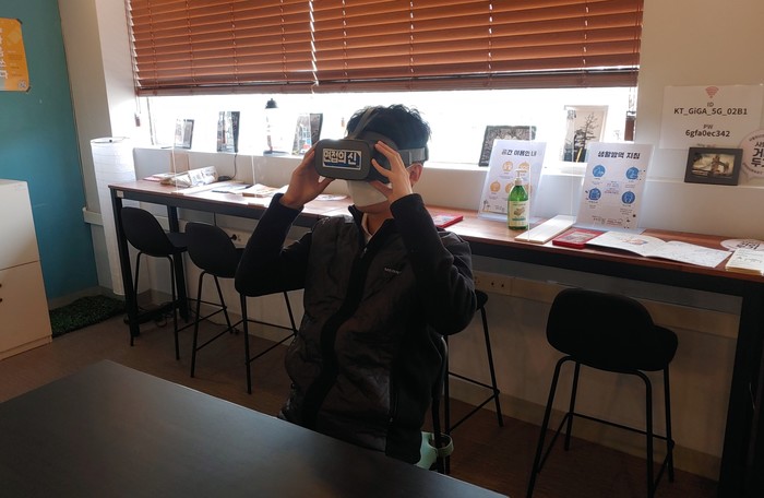 | ▲ ‘AI·VR 면접체험관’을 찾은 청년 구직자가 VR 면접을 체험하고 있다. (사진제공=관악구청) |