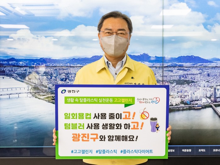 김선갑 서울 광진구청장이 최근 일회용품과 플라스틱 줄이기 실천을 위한 ‘탈 플라스틱 고!고! 챌린지’에 동참했다. 사진은 김 구청장이 ‘탈 플라스틱 고!고! 챌린지’에 참여하고 있는 모습. (사진제공=광진구청)
