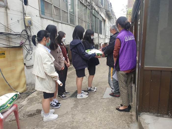 경기 하남시 미사중학교는 지난 28일 졸업생 교복 나눔 바자회를 통한 수익금으로 마련한 60만원 상당의 백미(10kg) 14포를 신장1동 지역사회보장협의체에 기탁했다. 사진은 미사중 학생들이 직접 홀몸노인 가구에 쌀을 전달하고 있는 모습. (사진제공=하남시청)