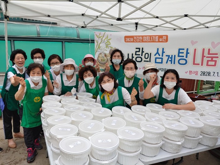 서울 성북구 월곡2동이 최근 주민센터 뒤뜰에서 지역내 취약계층을 위한 삼계탕 나눔 행사를 개최했다. 이날 새마을부녀회원들은 지역내 홀몸노인 및 돌봄 대상 노인을 위해 삼계탕을 직접 만들어 가정으로 전달했다. 사진은 기념촬영을 하는 모습. (사진제공=성북구청)