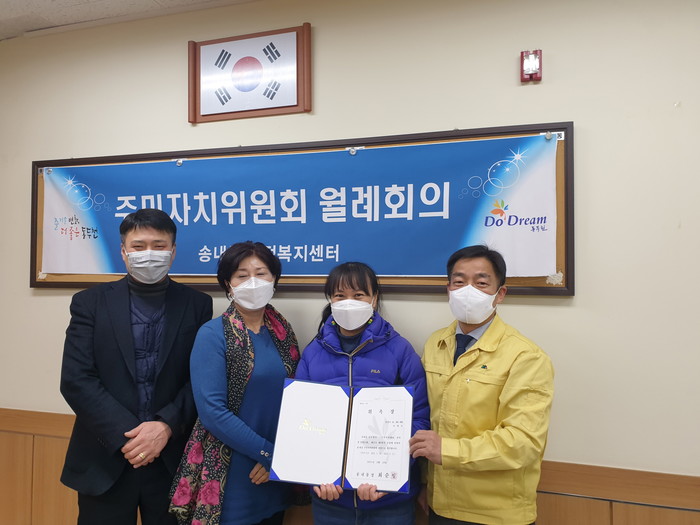 경기 동두천시 송내동 행정복지센터 최근 주민자치위원회 월례회의를 ZOOM 화상회의로 개최하고 함께 활동할 주민자치위원 1명을 신규로 위촉했다. 사진은 이날 위촉된 이명숙 신규 위원(45)과 관계자들이 기념촬영을 하는 모습. (사진제공=동두천시청)