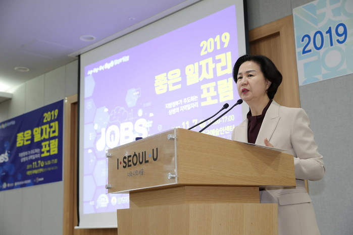 29일 서울시청에서 김수영 서울 양천구청장이 오는 11월7일에 열릴 ‘2019 좋은 일자리 포럼’과 관련한 기자설명회를 개최했다. ‘2019 좋은 일자리 포럼’은 국내 일자리 현안 이슈에 대해 토론하며 다양한 일자리창출 정책을 제안하는 소통의 장이다. 사진은 설명을 하고 있는 김 구청장의 모습. (사진제공=양천구청)