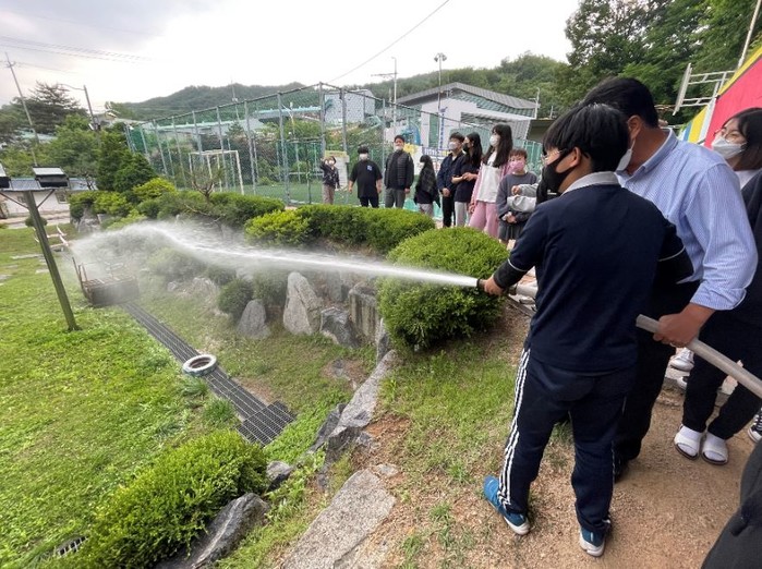 경기 포천시 청소년교육문화센터 방과후아카데미 '아름드리'는 최근 총 3회에 걸쳐 청소년 안전교육 ‘Save, 골든타임’ 프로그램을 운영했다. 이번 교육에서는 간이소화기·마스크 살균기 만들기, 화재대피훈련 및 소방안전교육 등을 진행했다. 사진은 참가 학생이 소방 호스 사용을 체험하고 있는 모습. (사진제공=포천시청)