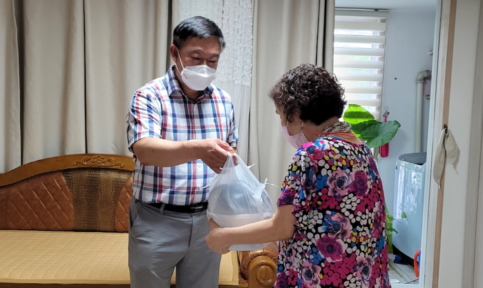 경기 포천시 소흘읍행정복지센터는 지역내 폭염 취약계층인 75세 이상 홀몸노인 가구 대상으로 나눔을 사랑하는 사람들의 모임에서 후원한 열무김치를 전달하고, 주거환경과 냉방기 점검 및 건강상태 확인 등 생활실태를 파악했다. 사진은 읍 관계자가 대상 가구를 방문해 안부를 확인하고 있는 모습. (사진제공=포천시청)