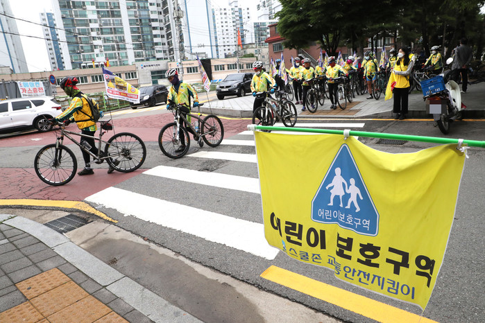 국토종주자전거길안전지킴이단연대 회원과 시민 50여명이 31일 서울 송파구 풍남초등학교 인근 횡단보도에서 자전거를 끌고 건너고 있다. 이번 행사는 2019년 말 일명 '민식이법'이 국회를 통과하는 등 어린이 교통안전에 대한 국민적 관심이 커져 스쿨존 내 교통사고 사망자 '제로'를 만들기 위해 마련됐다.