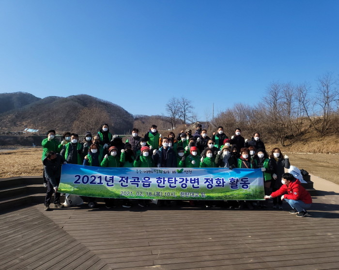 경기 연천군 전곡읍은 최근 한탄강변에 방치된 쓰레기를 수거하는 정화활동을 진행했다. 사진은 이날 환경정화에 나선 주민자치위원회, 새마을지도자 등 40여명이 기념촬영을 하는 모습. (사진제공=연천군청)