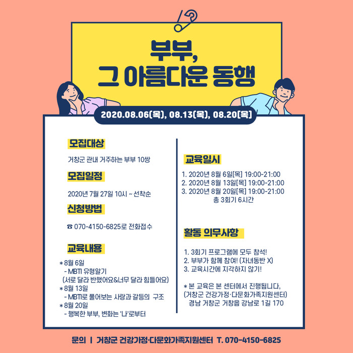‘부부 그 아름다운 동행’은 성격유형검사 MBTI를 활용해 부부 상호 간의 이해를 도울 뿐 아니라 갈등을 예방하는 시간을 가지며, 서로의 성격을 알고 다름을 이해하며 서로의 소중함과 유대감을 향상하기 위한 심리적·정서적 지원 프로그램이다.