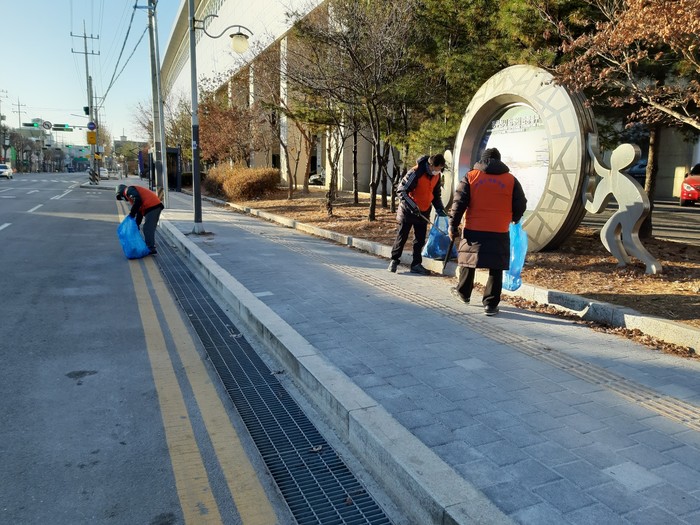 경기 동두천시자원봉사센터 소속 봉사단체인 로컬드림봉사회는 지난 16일 보산동관광특구 일대에서 거리청소를 실시했다. 사진은 봉사회원들이 추운 날씨에서 불구하고 보산동관광특구 거리에서 쓰레기를 줍고 있는 모습. (사진제공=동두천시청)