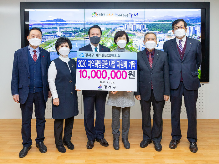 서울 강서구는 최근 지역 5개 새마을금고 이사장으로부터 지역희망공헌사업비 1000만원을 전달받았다. 기탁금은 (재)강서구장학회를 통해 지역 저소득층 학생들을 위한 장학기금으로 쓰이게 된다. 사진은 전달식에서 노현송 구청장(왼쪽에서 세 번째)과 관계자들이 기념촬영을 하는 모습. (사진제공=강서구청)
