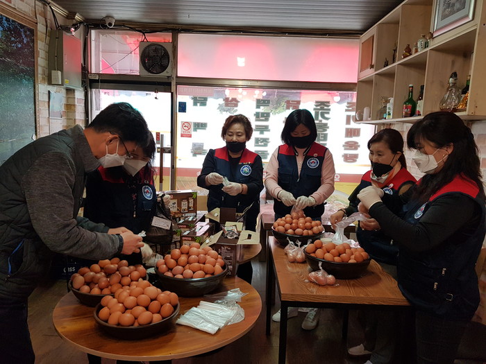 인천 남동구 간석4동이 최근 자유총연맹 간석4동분회로부터 홀몸노인을 위한 건강 간식으로 삶은 달걀과 두유를 전달 받았다. 이날 전달된 달걀 600개와 두유는 지역내 홀몸노인 100명에게 배달됐다. 사진은 삶은 달걀을 포장하고 있는 회원들의 모습. (사진제공=남동구청)