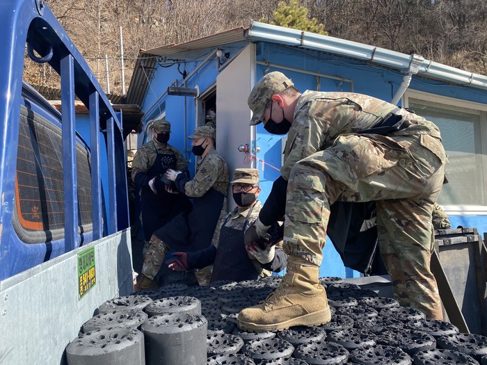 경기 (사)동두천시자원봉사센터는 최근 연탄은행과 연계해 미 3사단 순환대대 1-64기갑대대 25명과 함께 광암동에 위치한 취약계층 4가구 연탄 1300장을 배달했다. 사진은 이날 미군 장병들이 차가 들어가지 못하는 골목 언덕에 위치한 대상자 가구에 연탄을 나르고 있는 모습. (사진제공=동두천시청)