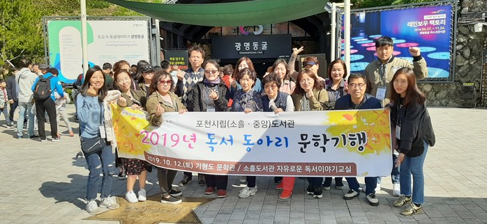 경기 포천시립도서관은 최근 ‘책을 읽고, 찾아가는 문학기행’을 개최했다. 이번 문학기행에는 독서동아리 회원 20여명이 참여해 광명시에 위치한 기형도문학관, 광명동굴, 꿈꾸는별책방, 북앤드로잉 등을 탐방했다. 사진은 기념촬영을 하는 모습. (사진제공=포천시청)
