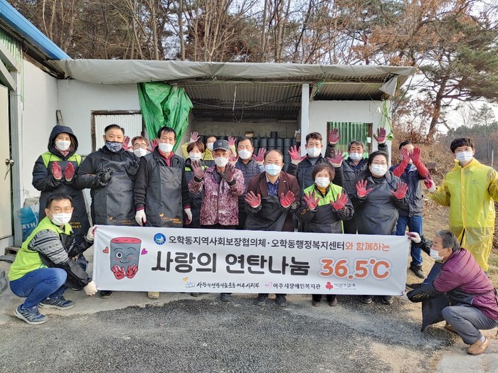 경기 여주시 오학동 지역사회보장협의체는 지난 7일 여주시장애인복지관·오학동행정복지센터 직원들과 함께 ‘사랑의 연탄나눔 36.5℃’ 연탄배달 봉사를 했다. 지역사회보장협의체는 ‘1인1나눔 계좌 기금’을 지원해 지역내 저소득가정 10가구에 연탄 총 3000장을 지원했다. 사진은 이날 봉사자들이 기념촬영을 하고 있는 모습. (사진제공=여주시청)