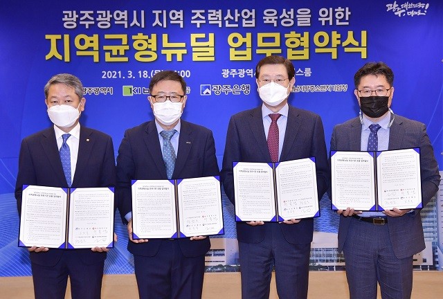 이들 기관은 18일 오후 광주시청 비즈니스룸에서 이용섭 광주시장, 정윤모 기술보증기금 이사장, 이춘우 광주은행 부행장, 장대교 광주전남지방중소벤처기업청장이 참석한 가운데 ‘광주광역시 지역주력산업 육성을 위한 지역균형뉴딜 업무협약’을 체결했다.