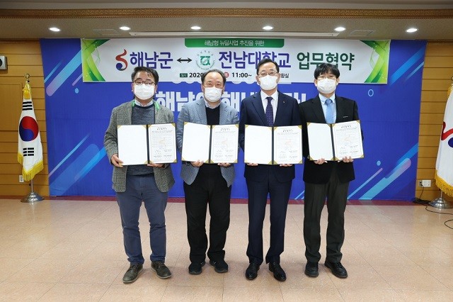 [해남=정찬남 기자] 전남 해남군은 3일 전남대학교와 한국판 뉴딜 사업에 대응하는 '해남 형(形) 뉴딜 사업' 추진을 위한 업무협약을 체결했다.