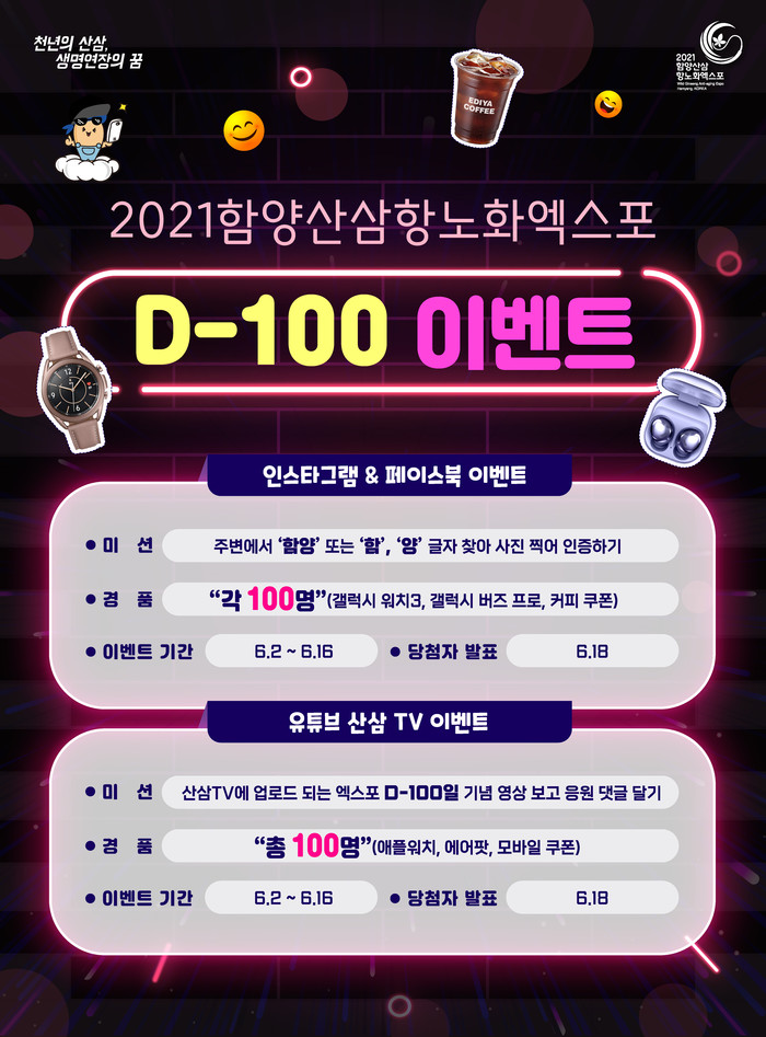 2021함양산삼항노화엑스포조직위원회(위원장 김경수 경상남도지사)가 함양산삼항노화엑스포 개최 D-100(6월 2일)을 맞이하여 엑스포 공식 SNS와 산삼TV(엑스포 공식 유튜브)에서 동시에 온라인 이벤트를 진행한다.
