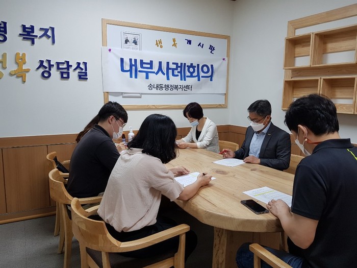 경기 동두천시 송내동 맞춤형복지팀이 14일 지역내 취약가구 중 코로나19 장기화 등 복합적인 문제로 위기에 처해 있는 가구에 대해 신속하고 실질적인 도움이 되는 맞춤형 복지서비스 지원을 위한 내부 사례회의를 열고 해결책을 모색했다. 사진은 회의 진행 모습. (사진제공=동두천시청)