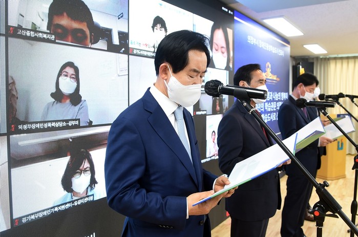 경기 의정부시는 지난 20일 장애인의 날을 맞이해 '장애인 평생학습도시 선포식'을 개최하고 온라인으로 생중계해 지역내 장애인·유관기관 등이 소통·화합하는 시간을 마련했다. 사진은 안병용 시장(왼쪽)이 관계자들과 장애인 평생학습도시 선언문 낭독을 하는 모습. (사진제공=의정부시청)
