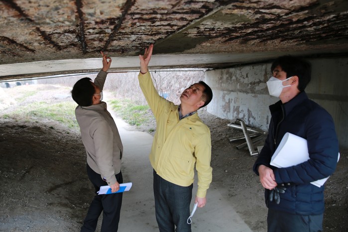 이병규 경기 수원시 장안구청장을 비롯한 관계공무원 10여명은 9일 지역내 주요 교량공사 현장을 돌아보고 공사장 안전관리 상태와 공사 추진상황 등을 점검했다. 사진은 이 구청장(가운데)이 관계자들과 현장을 살펴보는 모습. (사진제공=장안구청)