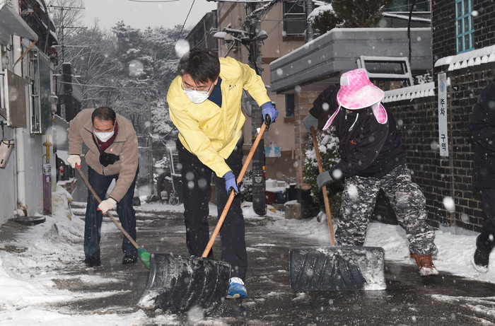 오승록 서울 노원구청장이 지난 12일 오후 내린 폭설로 주민들의 통행에 불편함이 없도록 신속히 제설작업에 나섰다. 사진은 오 구청장(가운데)이 월계1동에서 주민들과 함께 골목길 제설작업을 하고 있는 모습. (사진제공=노원구청)