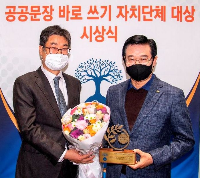 서울 용산구가 최근 우리글진흥원으로부터 2020년 공공문장 바로 쓰기 자치단체 대상(소통부문)을 받았다. 사진은 성장현 구청장(오른쪽)이 양영채 우리글진흥원 사무총장으로부터 ‘2020 공공문장 바로 쓰기 자치단체 대상’을 받고 기념촬영을 하는 모습. (사진제공=용산구청)