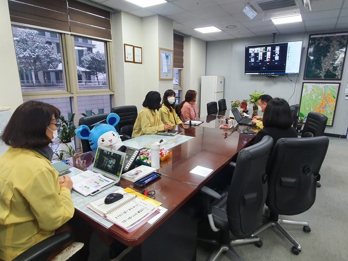 경기 양주시 회천2동은 지난 18일 행정복지센터 동장실에서 화상회의 플랫폼 ‘ZOOM’을 활용한 올해 첫 비대면 온라인 화상 통장회의를 개최해 올해 추진목표를 비롯한 동정 지표·동정 운영방향 등을 공유했다. 사진은 이날 화상 통장회의를 진행하고 있는 모습. (사진제공=양주시청)