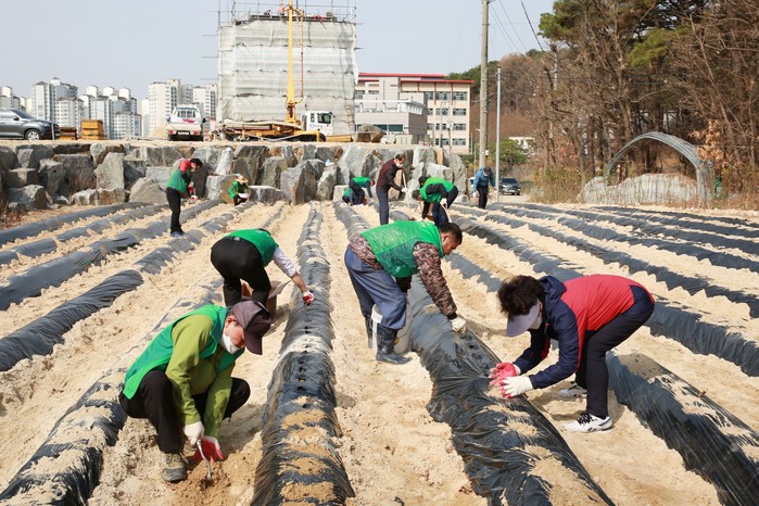 경기 수원시 새마을지도자 장안구협의회는 지난 19일 어려운 이웃과 단체에 나눔을 실천하기 위해 조원동에 위치한 ‘사랑의 텃밭’에 감자를 심었다. 사진은 새마을단체 회원들이 60kg의 씨감자를 텃밭에 심고 있는 모습. (사진제공=수원시청)