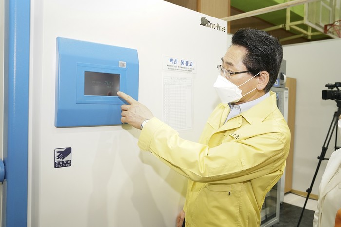 김영종 서울 종로구청장이 6일 종로구민회관(지봉로5길 7-5) 내 설치된 코로나19 예방접종센터에서 열린 ‘백신접종센터 개소를 위한 모의훈련’에 참여했다. 사진은 모의훈련에서 김 구청장이 백신 냉동고를 살펴보고 있는 모습. (사진제공=종로구청)