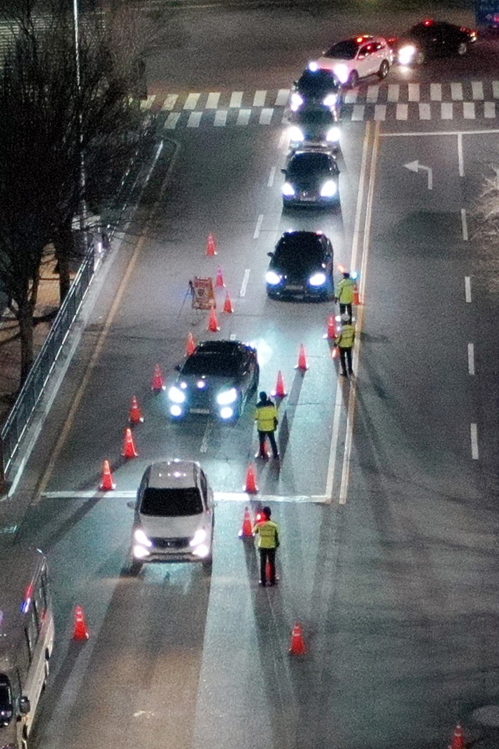 16일 오후 광주광역시 도심에서 코로나19 확산에 중단된 검문식 음주단속 대신 'S자'형 통로를 만들어 음주운전 의심차량을 걸러내는 '트랩(trap)'형 음주단속이 펼쳐지고 있다. 최근 코로나19 확산으로 검문식 음주운전 단속을 중단하자 광주에서 음주운전 사고가 급증했다. 이에 경찰은 운전자와의 접촉을 최소화할 수 있는 트랩형 단속을 도입해 운영하고 있다.