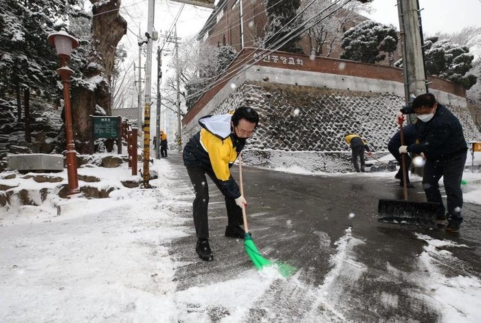 성장현 경기 용산구청장이 지난 12일 오후 원효로2동을 찾아 제설 작업 현황을 점검하고 직원들과 함께 눈을 치웠다. 원효2동은 언덕 지형이 많아 눈이 쌓이면 보행이 어렵고 빙판길 사고가 잦아 신속한 제설작업이 필요한 곳이다. 사진은 이날 성 구청장(가운데)이 직원들과 긴급 제설작업을 하는 모습. (사진제공=용산구청)