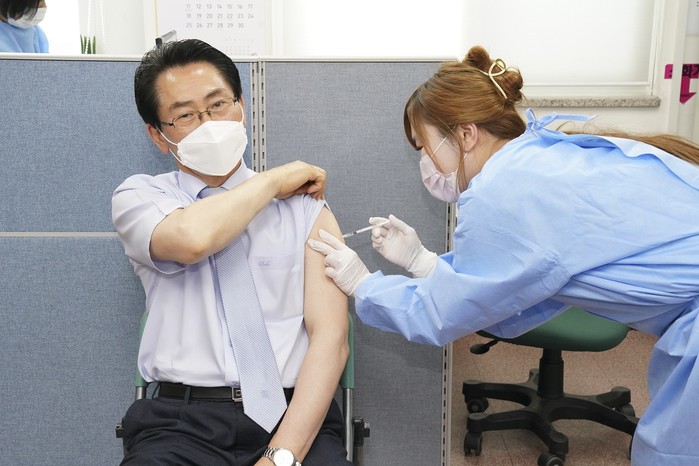 김영종 종로구청장이 지난 19일 종로구 보건소에서 아스트라제네카(AZ) 백신을 접종받았다. 사진은 김 구청장(왼쪽)이 백신을 접종받고 있는 모습. (사진제공=종로구청)