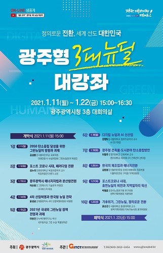 강좌는 ▲인공지능 중심의 디지털뉴딜 ▲국내 최초로 2045년까지 탄소중립 에너지자립도시 광주 실현을 위한 그린뉴딜 ▲광주형 일자리를 바탕으로 하는 상생과 안전의 휴먼뉴딜 등 광주형 3대 AI-뉴딜 정책에 대한 내용을 분야별 각계각층의 전문가들이 강의하는 식으로 진행된다.