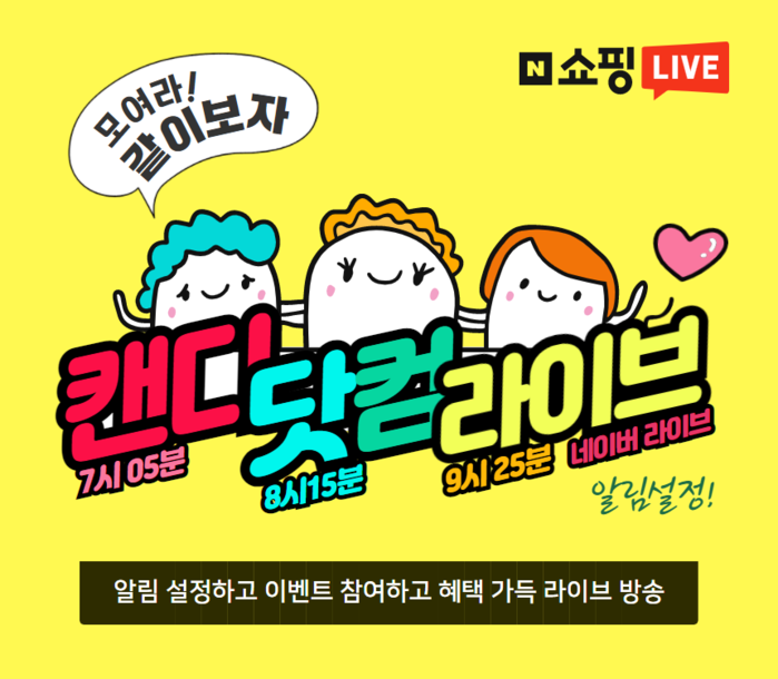 7월 첫째 주 캔디닷컴 라이브 일정과 5일 더블 더블치즈 닭갈비, 옹고집 김치모음 등 다양한 제품을 소개할 예정이다 캔디닷컴 라이브 방송에서 진행되는 제품은 최대 57% 할인, 복수 구매 시 추가 할인, 방송 알림 쿠폰 이벤트 등 매월 특별한 혜택으로 만나볼 수 있다.