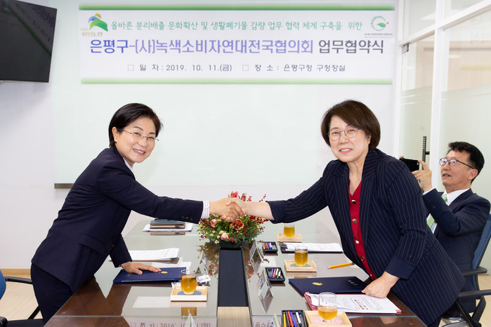 은평구가 쾌적하고 깨끗한 자원순환도시 은평을 만들기 위해 최근 (사)녹색소비자연대전국협의회와 올바른 분리배출 문화확산 및 생활폐기물 감량 업무 협력체계 구축을 위한 업무 협약(MOU)을 체결했다. 사진은 협약을 체결하며 악수를 나누고 있는 김미경 구청장(왼쪽)과 박인례 대표의 모습. (사진제공=은평구청)
