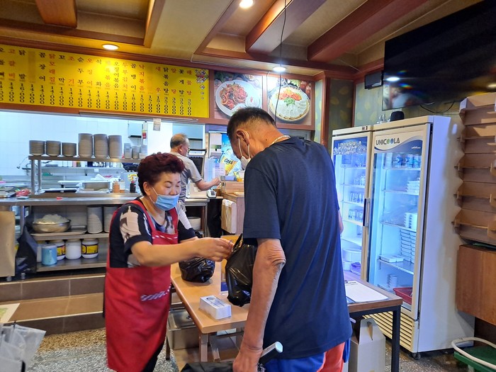 경기 동두천시 생연2동 소재 착한식당 '눈보라'가 최근 지역내 저소득 및 홀몸노인 10가구에 정성껏 준비한 칼국수를 후원했다. 눈보라는 매분기 지역내 홀몸노인을 대상으로 식사 지원 봉사 등을 실천하는 등 지역사회 복지 향상에 기여하고 있다. 사진은 박신자 대표가 대상자에게 칼국수를 전달하고 있는 모습. (사진제공=동두천시청)