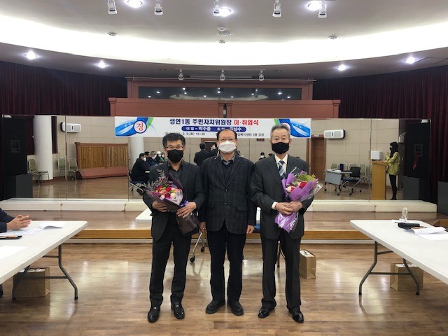 경기 동두천시 생연1동 주민자치위원회는 최근 박수종 위원장 이임식 및 제12대 김상수 위원장의 취임식을 열었다. 사진은 이날 이임식 및 취임식에서 박 위원장과 김 위원장이 관계자와 함께 기념촬영을 하는 모습. (사진제공=동두천시청)